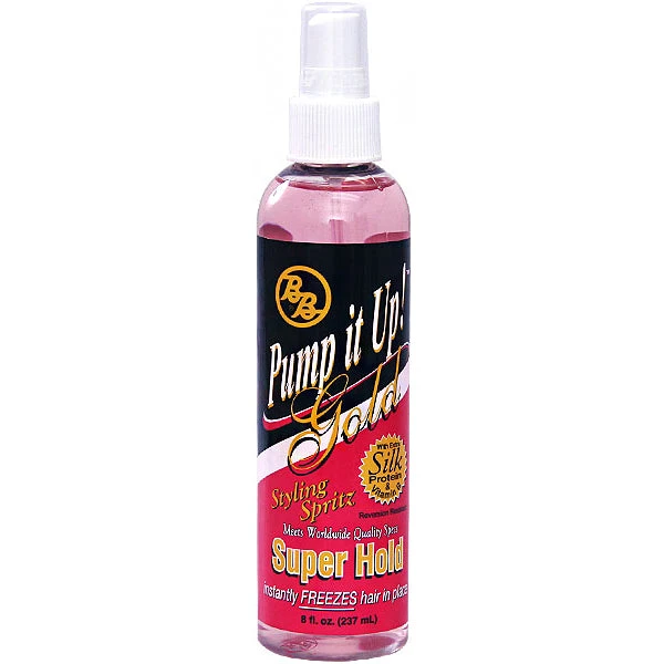BB Pump It Up Gold – Super Hold does just what the name says. Super Hold Gold dries quickly leaving your hair exactly as you shape, spike. sculpt, style, scrunch, wave, or design it. Pump It Up Gold goes beyond styling the hair. It enriches and protects with Silk Protein and Panthenol leaving a lustrous, healthy, lasting style. Pump It Up rinses out easily and leaves no buildup. Dries faster and has greater holding power and more conditioners than regular spritz.