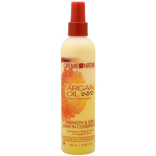 Creme of Nature Argan Oil Strength & Shine Leave-In Conditioner This unique formula combines Argan Oil liquid shine and a strengthening protein complex that improves hair strength, protects against damage and adds luminous shine and moisture.