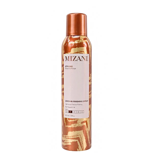 Mizani Styling Lived-In Finishing Spray lightweight texture finishing. The finishing touch for beachy, wind blown effects. Instantly add natural looking hold for a flexible soft-matte finish that lasts. Ultimate finishing for the look of lived in hair, long bobs, long straight looks, un-done styles, and tousled hair-dos.