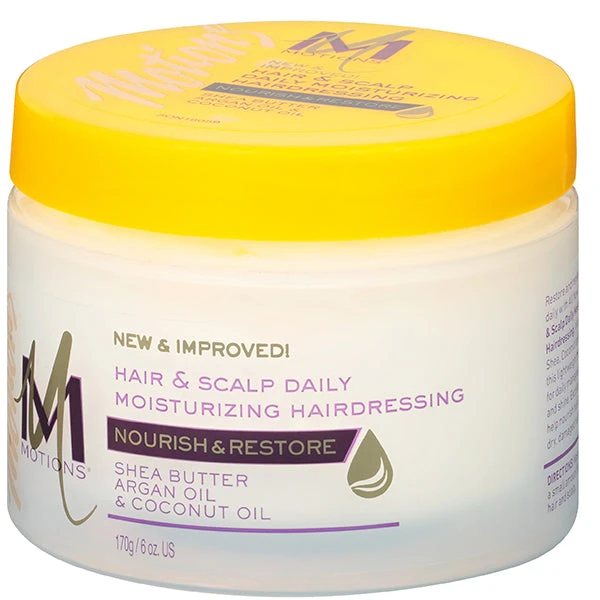 Motions Hair & Scalp Daily Moisturizing Hairdressing nourish and restore. Restore and replenish moisture daily with All New Motions Hair & Scalp Daily Moisturizing Hairdressing. Infused with Shea, Coconut, and Argan Oils, this lightweight trio is perfect for daily manageability, softness and shine. Excellent solution to help nourish hair and restore dry, damaged hair textures.