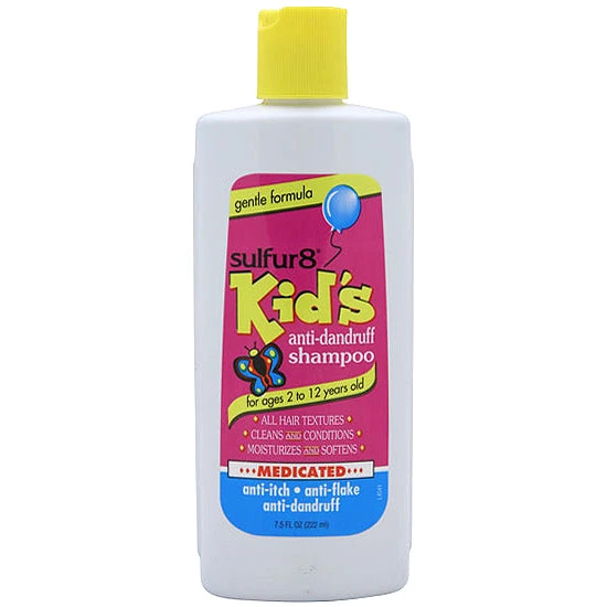 Sulfur8 Kids Anti-Dandruff Shampoo medicated anti-itch, anti-flake, anti-dandruff, for ages 2 to 12 years old. All hair textures, cleans and conditions, moisturizes and softens. Controls scalp itching and flaking due to dandruff.